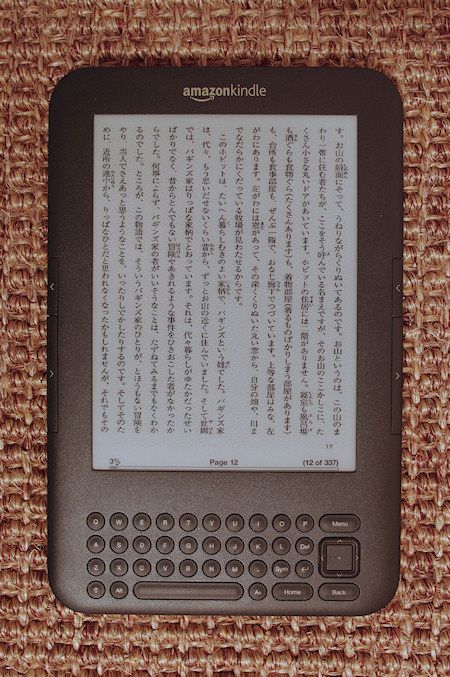 Amazon doesn’t sell Japanese books for the Kindle, so you have to find your own. Luckily, this is pretty simple (usually). Various places around the web have free Japanese texts available for download, you can use Instapaper on Japanese websites, and of course there is the treasure trove that is Aozora Bunko.